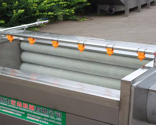 利用硬质毛刷在清洗机内的慢速转动以及物料之间的相互摩擦,上部装有两根均匀出水管连续出水,底面与侧面中下部均布高低不平的硬质毛刷,可实现玛咖在机内的无规则翻滚,一次玛咖的清洗时间约为5-10分钟 (具体看玛咖的清洁程度)。操作说明为首先打开机器顶盖,倒入一定量的玛咖、玛咖的数量不可过多,一般为3层以下,通入水源使土豆湿润,开动电机带动毛刷旋转,清洗15分钟左右即可打开放出玛咖进行干燥。这种玛咖清洗机相比市场上的要容积大,清洗效率高,可连续清洗,且操作十分简便,洗完后呈现为本色,无残留杂质,有效的去除残留的农药,可以大大提高客户的销售价格。具有清洗有效容积大、效率高,节水,可连续清洗,操作简单,使用寿命长等特点,刷辊材料经特殊工艺处理,经久耐用,耐磨性能好。 可根据客户要求定制规格.本机器具有清洗干净工作效率高以达到省工省时的效果,零损耗。