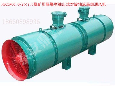 FBCDNO5.0/2?7.5煤矿用隔爆型抽出式对旋轴流局部通风机用途:该风机适用于煤矿井下含爆炸性物质(瓦斯和煤尘)的环境中。作抽出式局部通风,可满足矿山通风网络和安全生产的需要。抽排井下局部瓦斯积聚或与除尘装备联合使用排除工作面粉尘,改变工作环境,是抽出式局部通风的理想装备。