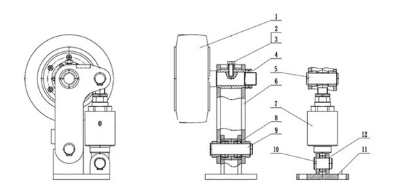滚轮罐耳是我公司自行研制开发的组合钢罐道导向装置,滚轮罐耳主要由滚轮、支架、弹簧缓冲装置,底座等组成。弹簧缓冲装置由调节套、调节螺杆、螺母、碟簧轴、导向套、并帽、紧定螺钉、碟簧、平键、缸筒等组成。