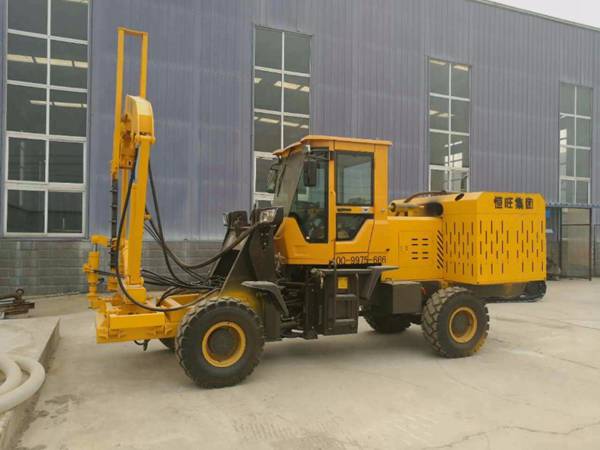 装载机式护栏打桩机是恒旺集团根据市场需求和自身技术成熟的情况下向客户需求而研发的一款产品,是集装载、打桩、钻孔等功能为一体的新型产品。采用全新设计理念、精心研制整体功能,结构模块化兼顾的设计思想,全封闭各木式安装结构,更利于产品快速安装和转场,可广泛运用于公路、高速等路面护栏的桩孔钻进工作。