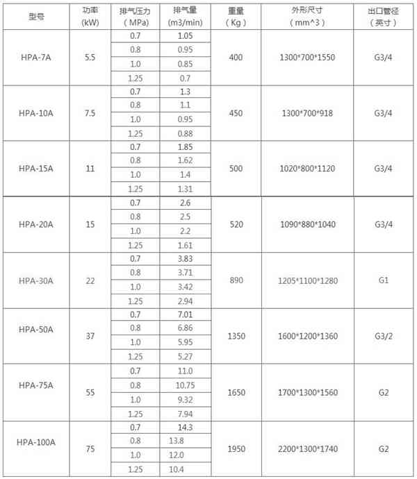 HPA系列空压机技术参数压缩介质:空气工作原理:螺杆式压缩机润滑方式:机油润滑空压机功率:5.5-75kw型式:固定式压缩机性能:可变频噪音:60?2(dB)排气量:0.95-12.8m3/min转速:350-3900r/min