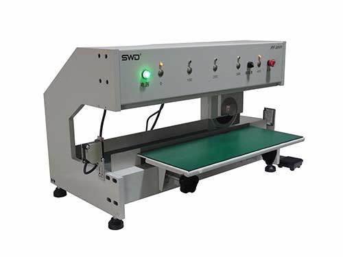1.走刀式分板机采用上圆刀下平刀方式,PC板至于下平刀上,开关一踩,上圆刀横移至所设定的定点,即将PC板切断分割,切断不脱丝,切口平整;