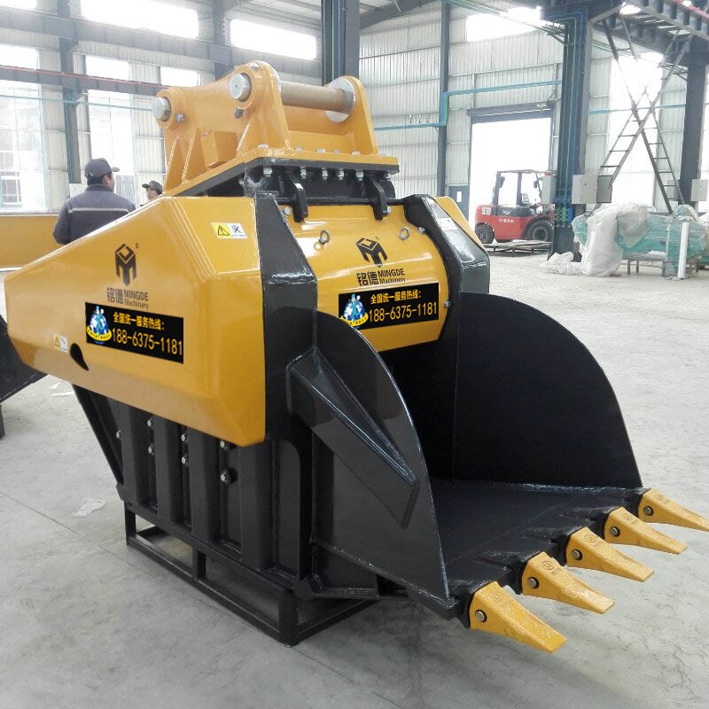 装置具有破碎装物料灵活,工作可靠,制造维护容易,适应性强,成本低等突出优点。广泛应用于矿山建筑材料交通等行业中,特别是在建筑垃圾处理方面体现出节能减排作用,利用挖掘机液压油缸来驱动破碎,原理和破碎机一样,通过颚板挤压物料,在破碎斗出料口有调节装置,可以根据需要破碎的大小来调节,出料产量一般每小时20吨左右,也要看挖机师傅操作熟练度,破碎物料大小,物料硬度和挖机工作状况等因素。此设备适用于多品牌挖机,根据吨位大小配给的破碎斗型号也不同,工作方便,可以现场破碎物料,像拆迁施工,山路维修等会节省大量时间,同时能节省部分运费,破碎后的混合料可回收可回填,还能节省基建所需的费用,总体来说这款挖掘机破碎斗移动方便,无论到哪都是破碎站