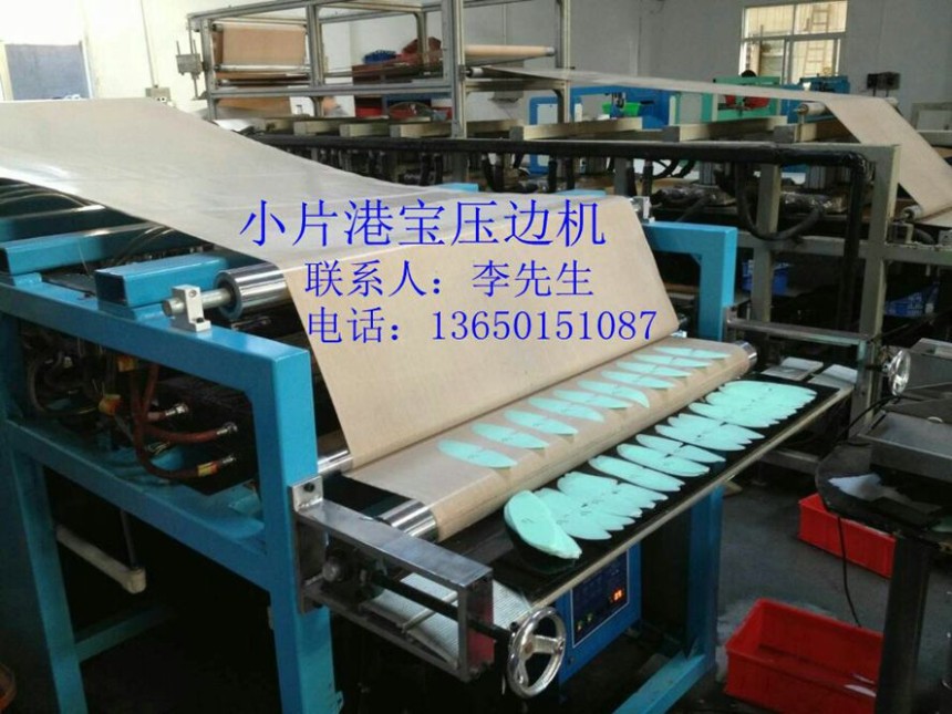 3、港宝小片压边成型机,生产流程:刀模先裁好小片,再经过压边机加热压边或辊压使小片周边压薄,然后经过冰水冷却,输送到后面自动缷料,一双一双的周围薄的好像削边的港宝小片就加工出来了。