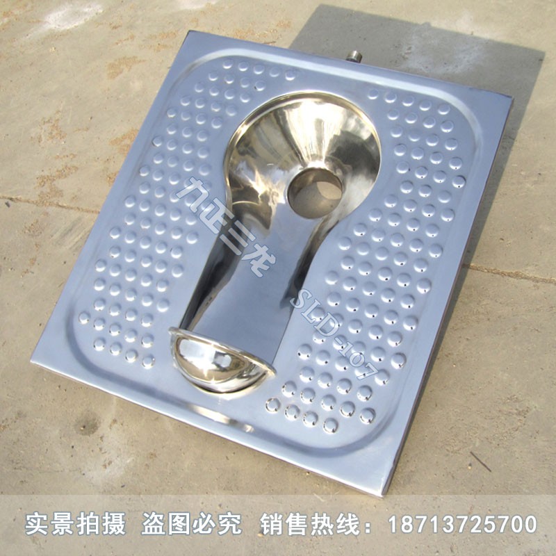 不锈钢防滑帽蹲便器由不锈钢板,盆,门挡组成,外观华丽,亮洁尤其上面协调的圆形帽更起到了决定性的防滑作用,当入厕后可能会有水喷溅,所有防滑一定要做好.