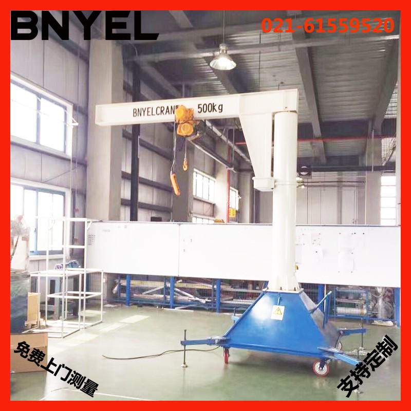 移动式旋臂起重机在300?的回转悬臂的一端上配置环链电动葫芦(或钢丝绳电动葫芦),用于对货物或工件的起吊作业:另一端设置配重,与起重臂相