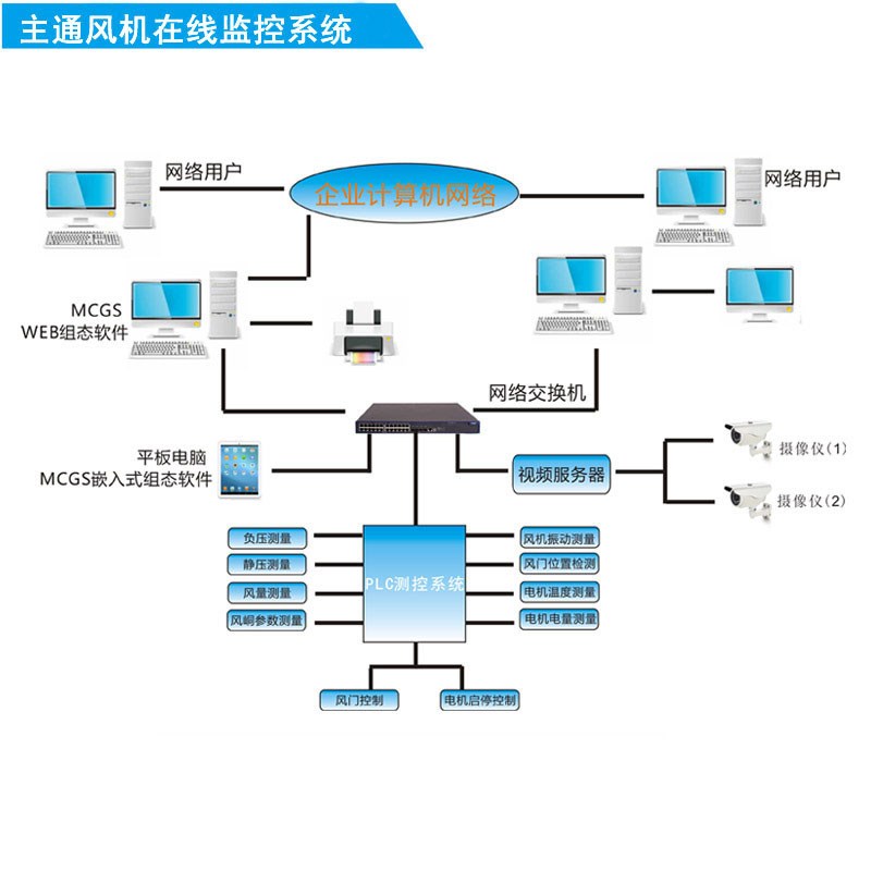 矿井主通风机是向井下送风的重要设备,也是大型耗能设备,对其实现在线监测监控,使之始终运行在良好状态,对于保障煤矿安全生产,保护矿工生命和企业财产安全,降低风机能耗具有重要意义。我公司成功研制开发的矿井主通风机网络在线监控系统,综合利用现代传感技术、微电子技术、自动控制技术、计算机技术、网络通讯技术,基于企业计算机网络实现主风机运行参数、通风数据的实时监测与风机主辅设备控制的一体化,监测内容丰富,控制功能完善,具有实时性强、安全可靠、操作方便、易学易用的特点。