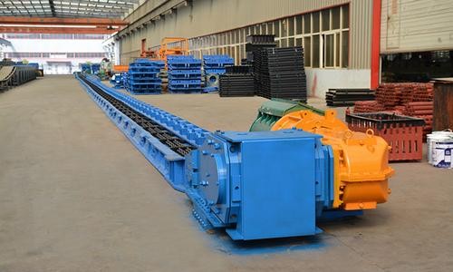 今天给大家介绍个大家伙——综采刮板输送机。这是由刮板机嵩阳煤机生产的一款大重型刮板机。综采刮板输送机又称综采刮板机。主要用于大型煤矿或矿产企业,可与采煤机、液压支架配合使用,综采刮板输送机不只是一台刮板机,它可以说是多台机器的合体。也正因此它能完成工作面放煤、装煤、运煤、推溜、移架等作业。下面咱们就来了解一下嵩阳煤机生产的这款大重型综采刮板输送机。
