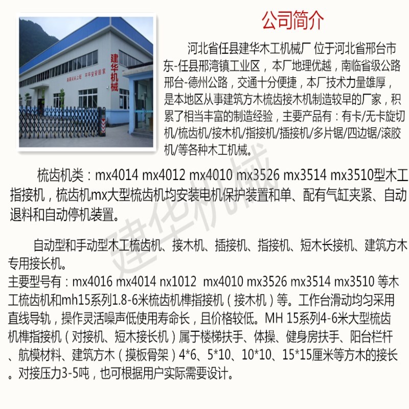 mx400型自动双端梳齿榫开榫机由机架部件、传动部件、送料、压料部件,气压系统、液压系统和电气系统控制组成。主要工作表面全部经过车、铣、磨等工艺加工,保证芯条梳齿精度;整机采用PLC程序控制,实现了芯条的输送、划线、齐头齐头锯、梳齿及回转全过程的自动加工。