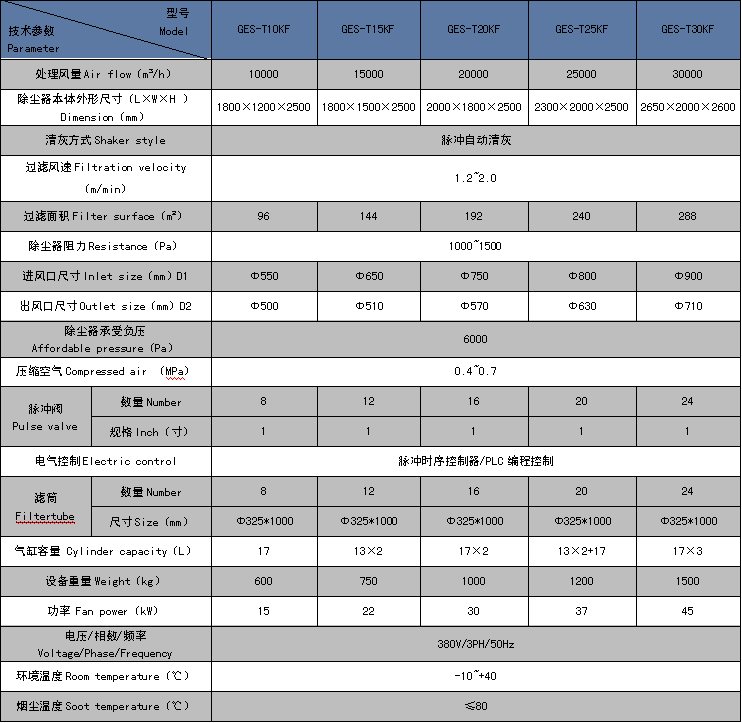 GES-TNKF系列分体式滤筒除尘器由于除尘系统、动力单元和电控单元分成3个模块分体设计制造,因此能够设计组合成更大风量的除尘系统,有助于客户使用途中的日常维护保养,设备结构合理、可多台并联组合,安装快捷方便。广泛应用于金属加工等行业的多工位打磨、焊接,机器人焊接、切割(激光、等离子、火焰)烟尘集中治理,新材料加工粉尘、木材和纸制品加工粉尘治理。控制系统采用工业级PLC全自动控制,可选配远程智能遥控操作,性能稳定维护方便。在实际应用中烟尘通过吸气罩、吸气臂、集尘口等收集装置和除尘管道进入除尘器,内置阻火器将烟尘中的高温颗粒拦截下来,后经专用阻燃覆膜滤筒过滤将烟尘阻留在滤筒外表面,使净化后的气体符合JB/T10341-2002的排放标准。