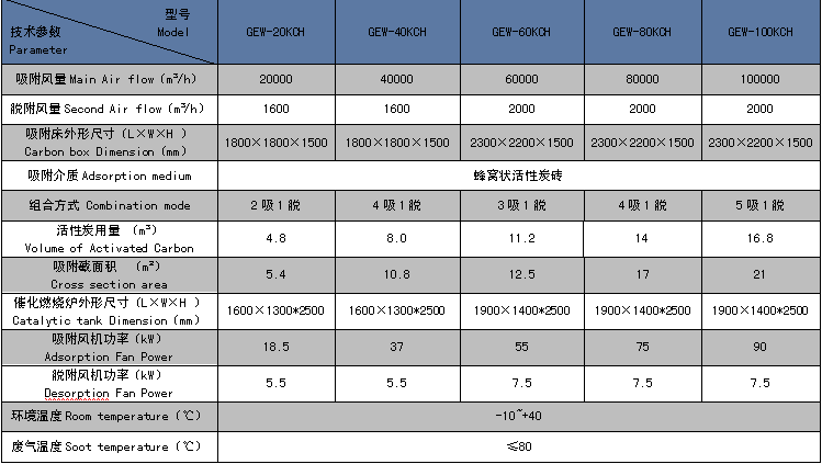 1、吸附床采用吸附性能好、气流阻力小的蜂窝状活性炭,气流分布均匀、压降小;