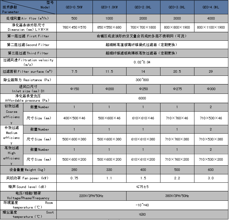 其过滤结构采用三级过滤,包括金属网初效过滤器、F8袋式过滤器、高效过滤器等组成。①金属网初效过滤器采用多层扩张铝箔网或不锈钢网作为过滤器的专用滤材,经碾压成波浪形,以正确的角度彼此交叉叠合排列而成。阻力低、使用寿命长、可反复清洗、经济性高、耐高温、耐酸碱。②中效袋式过滤器采用合成纤维以特殊织法制成。滤材内含静电纤维,具有高捕尘力,高粉尘载量及高透气性,高使用寿命,用于高效过滤器前置过滤,经济适用,安全环保,使用更换方便。③高效过滤器采用超细玻璃纤维滤纸或PP高效滤纸做滤料,以折叠的胶板纸、铝箔板等材料进行分隔,新型聚氨酯密封胶进行密封,低压损、高效率、重量轻等优点。广泛应用于对洁净度要求较高的民用或工业洁净产所的末端过滤。