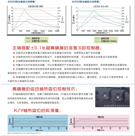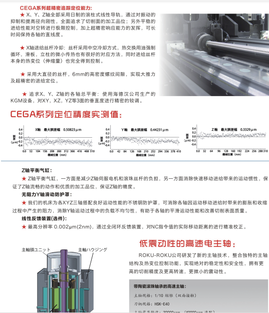 4.低震动的高速电主轴,主轴搭配?0.1?C超高精度的油温冷却控制器5.高精度的运动轴热变位控制技术