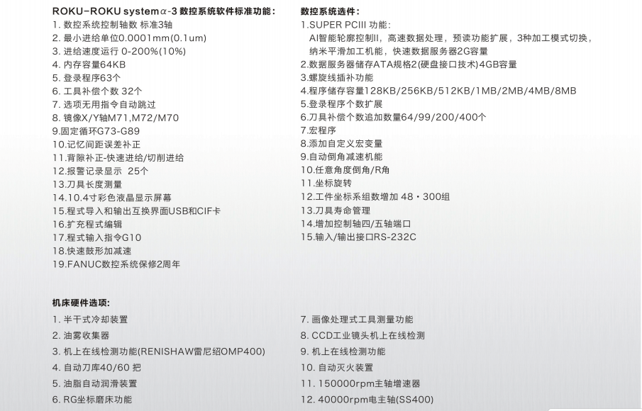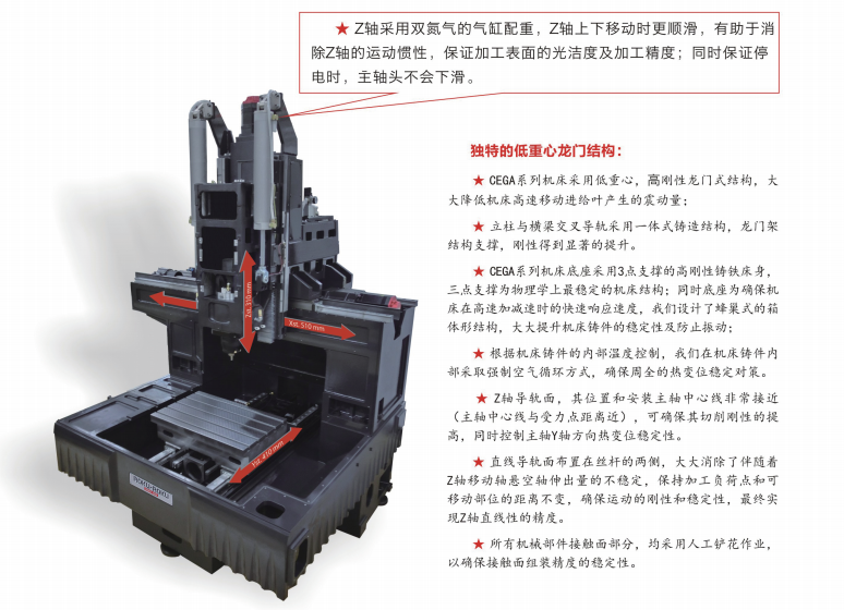 1.超硬材料加工的高刚性机床结构,Z轴采用双氮气的气缸配重