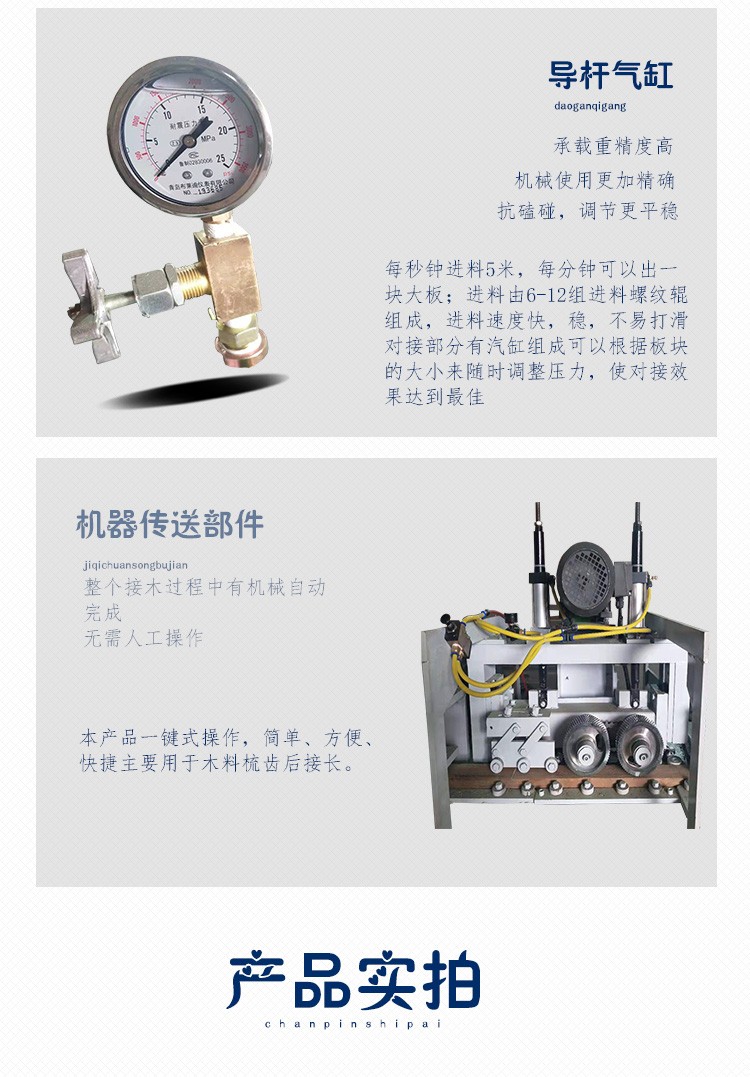 特点:1高性能液压动力系统,结合力强,动作流畅;2 (气)液缸为通过ISO9001的产品;3独特 设计的自动调压接合装置,确保整支接头尾结合力一致、牢固;4对接压力最大可超过10吨;5可流水线作业, 自动上料、自动加压、自动对接、自动推出,比一般对接机快2-3倍。