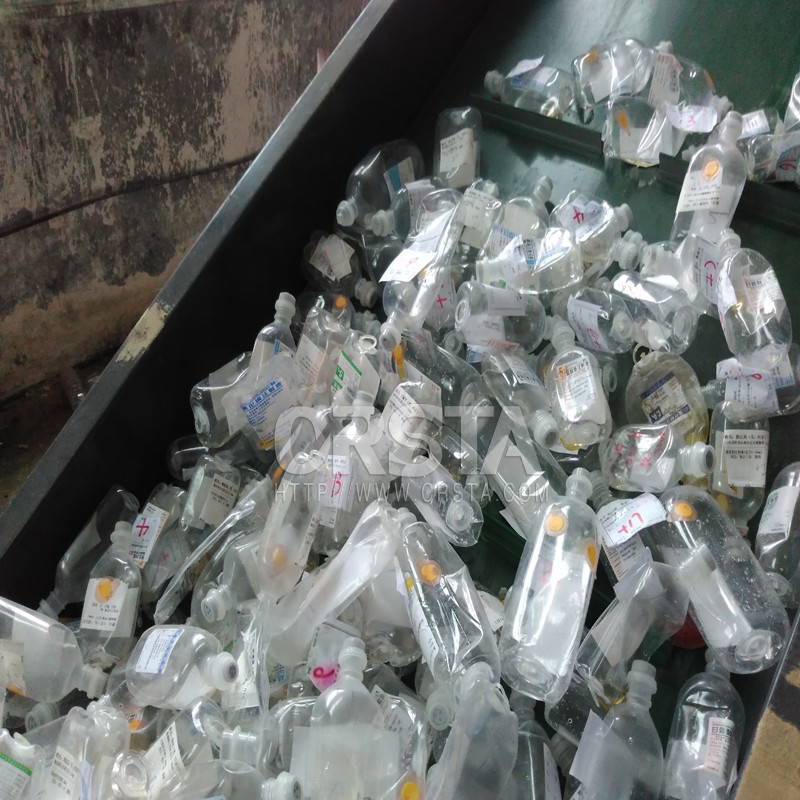 输液瓶废塑料回收加工生产线设备主要用于对输液袋非违禁类废塑料的回收分类、清洗加工、造粒等的加工处理。经过分选、粉碎、收集残余药剂、清洗剔除纸浆标签、分离橡胶及铝盖、分离袋(瓶)身与袋(瓶)嘴、分离发泡聚氨酯工序后可生产出纯净的“医用级二次聚丙PP”、医用级二次复合膜颗粒、聚异戊二烯橡胶及发泡聚胺脂,其产程度可达塑料原料工业甲等二级(可用于除食、药品包装用途外其它所有工业用途)。