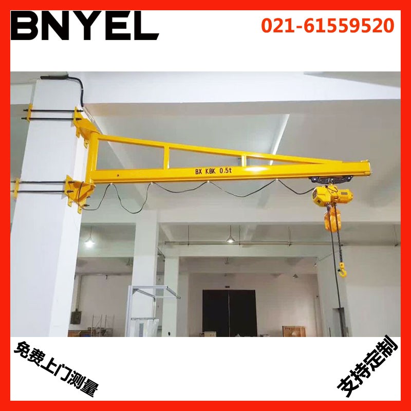 墙壁式旋臂起重机(又称:壁柱式悬臂起重机,壁柱式悬臂吊,壁柱式旋臂吊,墙壁吊,墙壁式悬臂起重机)是彬野起重公司参照进口设备研制的新产品,根据用户需要设计的专用起重设备。具有结构新颖、合理、简单、操作使用方便、回转灵活、自重轻、载荷移动灵活等优点,是节能的物料吊运装备。可广泛利用于厂矿、车间的生产线、装配线和机床的上下活及仓库、码头等场合的重物吊运。墙壁式旋臂起重机(墙壁吊)由支架、旋臂装置及环链电动葫芦等组成。悬臂固定在墙壁或水泥柱上,可根据用户需求进行回转。回转部分分为手动回转和电动回转。环链电动葫芦安装在悬臂轨道上,用于起吊重物。结构及操作本机主要由1、悬臂2、回转装置3、环链电动葫芦组成。环链电动葫芦有起重和在横梁上往复运行的功能。悬臂梁可由回转装置上的的减速机带动滚轮进行回转运动。电器部分见附图:电气原理几电气接线图。电器控制箱安装在环链葫芦上。