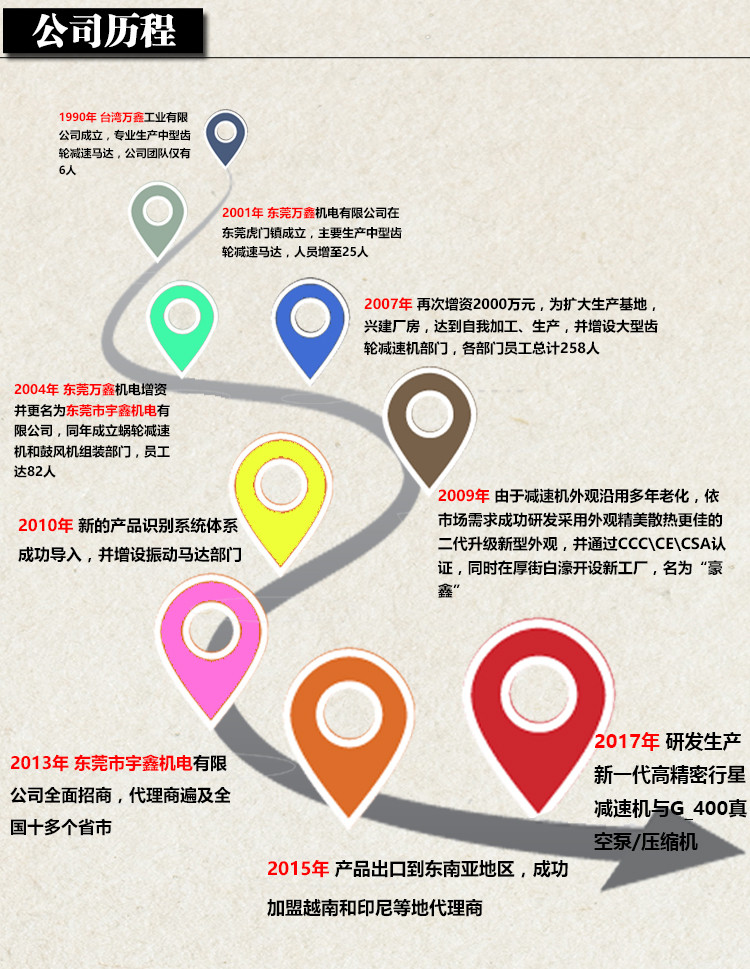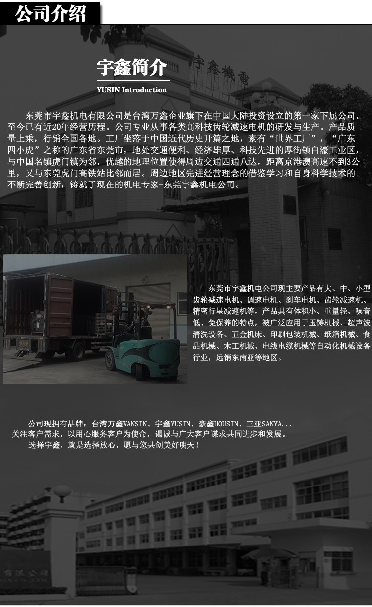 东莞市宇鑫机电有限公司系台湾万鑫企业旗下在中国大陆投资设立的第一家下属公司,其后又不断壮大,先后在上海昆山等地设有分厂,至今已有近20年经营历史。公司专业从事各类高科技齿轮减速电机的研发与生产。产品质量上乘,行销全国各地。生产和销售厂家均坐落于中国近代历史开篇之地,素有“世界工厂”,“广东四小虎”之称的广东省东莞市,工厂地处交通便利、经济雄厚、科技先进的厚街镇白濠工业区,与中国名镇虎门镇为邻,优越的地理位置使得周边交通四通八达,距离京港澳高速不到3公里,又与东莞虎门高铁站比邻而居。周边地区先进经营理念的借荐学习和自身科学技术的不断完善创新,铸就了现在的机电专家-东莞宇鑫机电公司。