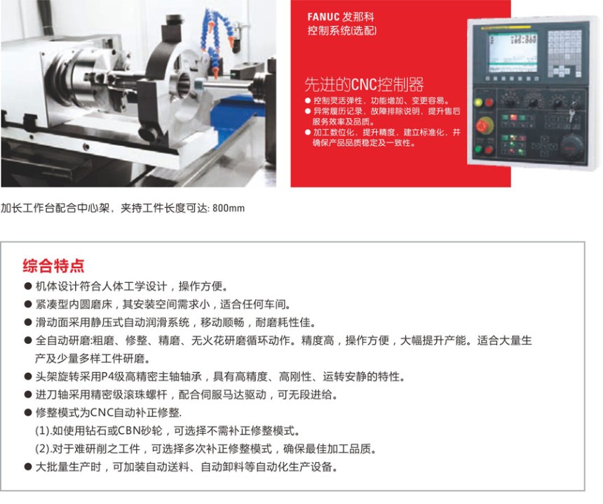 6.进刀轴采用精密级滚珠螺杆,配合伺服马达驱动,可无段进给。修整模式为CNC自动补正修整。