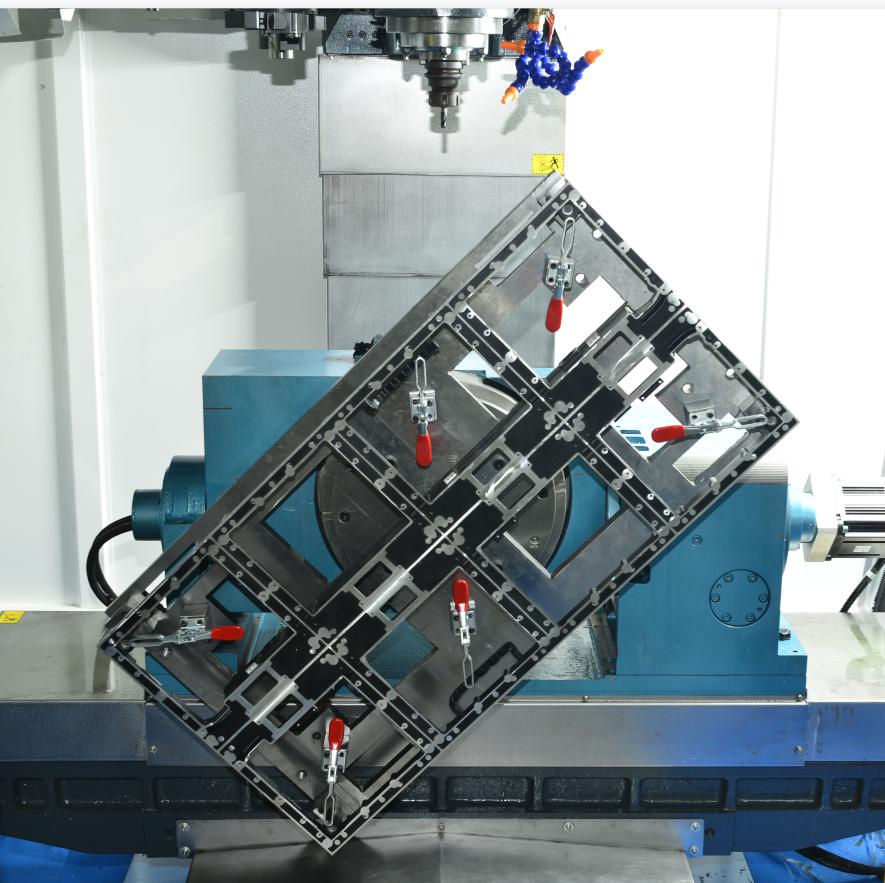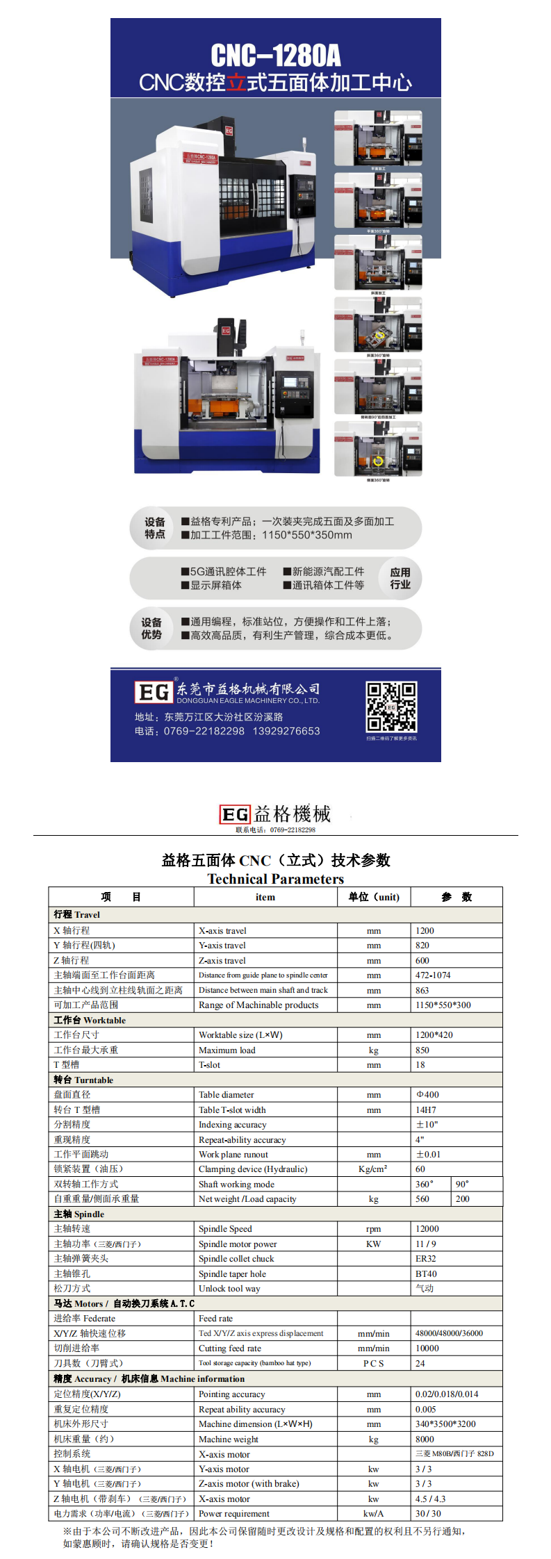 五面体CNC加工中心:拥有多项技术专利,可以选择立式和卧式两种型号,是益格公司最新研发的产品。本设备可以实现5个不同工作面的加工,以及在5个不同面中又可以进行不同角度的侧面加工,最大加工范围是1100*650*250mm。本设备广泛应用于5G通信大工件、LED大型箱体、新能源汽车配件以及有多面加工要求的大型工件。