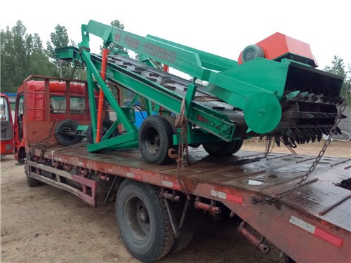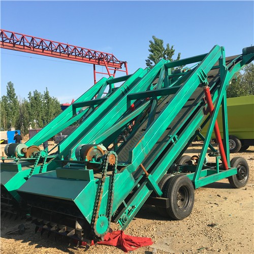 青贮取料机,包括机架,斜梁,从动辊,主动辊,取料杆,调节油缸,输送带,其特征在于:机架底端两侧分别设置有行走轮,机架中部设置有斜梁,斜梁左端底部设置有从动辊,斜梁右端上部设置有调节油缸,调剂油缸右端设置有推杆,推杆右端设置有主动辊,推杆下端右部设置有导料板,主动辊与从动辊之间设置有输送带,斜梁中部底端设置有若干弹簧,弹簧底端设置有调节辊,调节辊与输送带形成配合,机架上部设置有可转动的取料杆,取料杆与斜梁之间设置有推举油缸,取料杆左端设置有取料辊轮,取料辊轮通过皮带与取料电机相连接,取料辊轮上设置有若干取料刀,取料杆左部上端设置有辅助电机,辅助电机左侧中部设置有转轴,转轴上设置有螺旋桨叶。