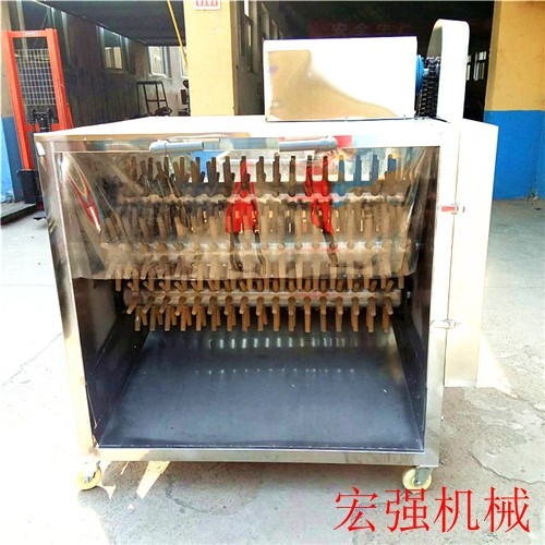 7轴鸡鸭鹅脱毛机,根据家禽大小,一次可以放入10只鸡,6-7只鸭,3-4只鹅。用户可以根据家禽大小自行决定投放数量,投放的过多会造成脱毛不彻底。在脱毛前要将家禽先进行浸烫,我们公司有各种型号的浸烫机,可以根据需要进行搭配使用,也欢迎咨询我们,我们会给您提供购买指导。脱毛机脱毛时间是1分钟左右,脱毛完成后需要脚踩开关打开,脱完的白条就出来了。