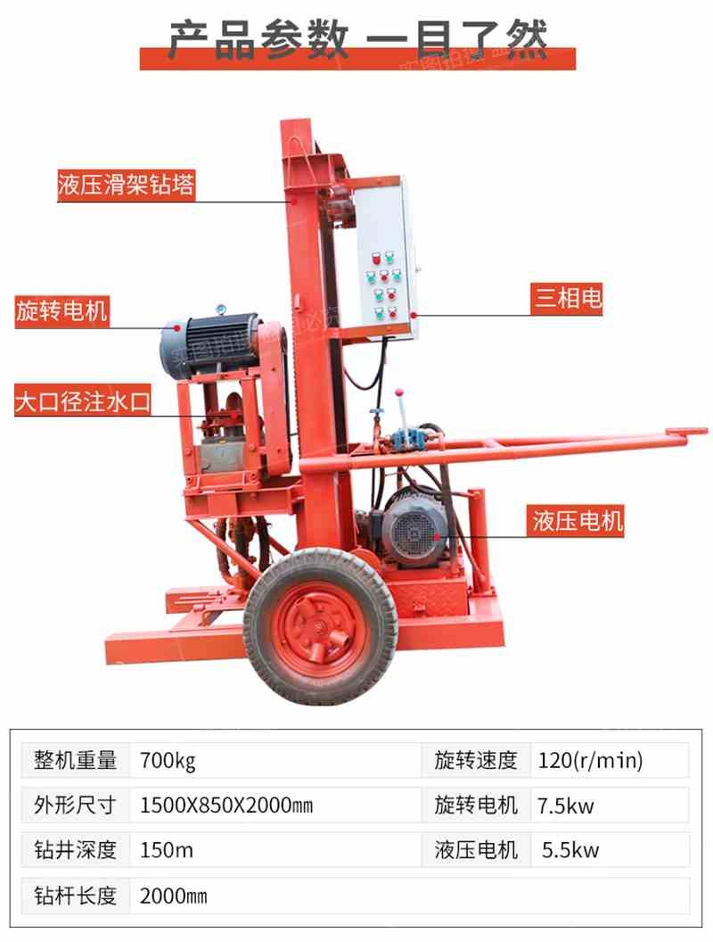 三相电液压打井机适合泥土层、流沙层和少量的岩层,主要用于钻凿民用吃水井、灌溉井、地源热泵空调井、降水井,打小型基础桩,通声测管等。三相电液压打井机轻便小巧,成孔速度快,噪音小,机械自动上卸钻杆,移动方便。