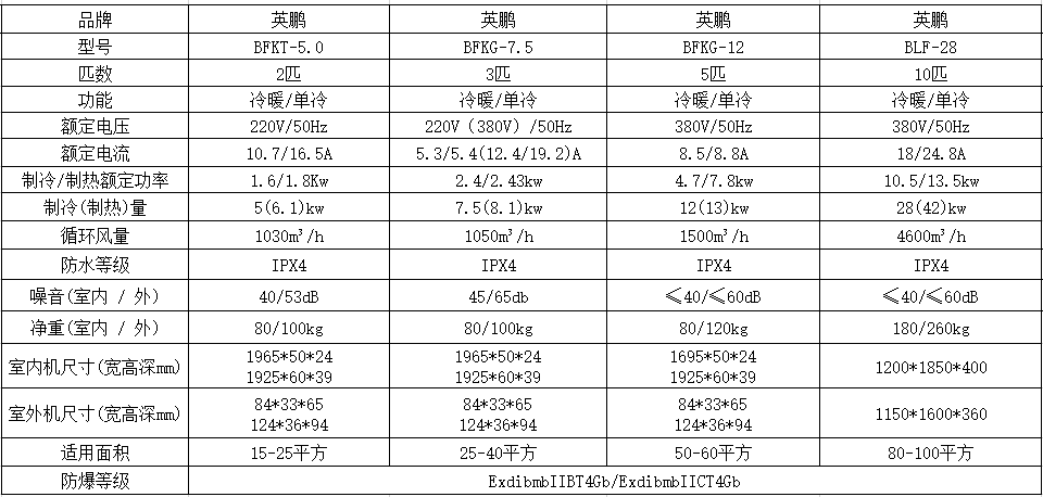 英鹏防爆空调(分体壁挂式、分体天井式、柜式)产品特点: