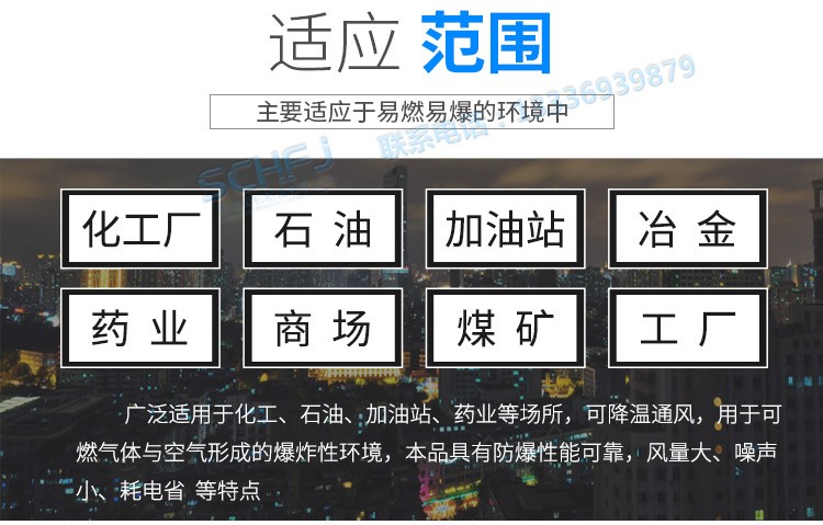 2、在石油、化工、机械、医药、冶金等行业的车间、仓库、办公室、加油点等场所,作通风换气及防暑降温之用;