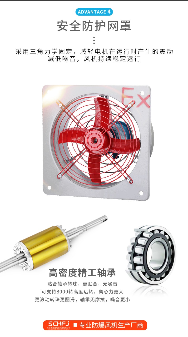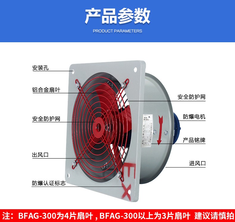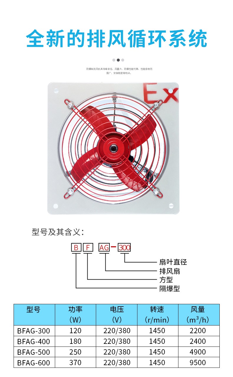 BFAG防爆排风扇,由电动机带动风叶旋转驱动气流,使室内外空气交换的一类空气调节电器。又称通风扇。排风的目的就是要除去室内的污浊空气,调节温度、湿度和感觉效果。