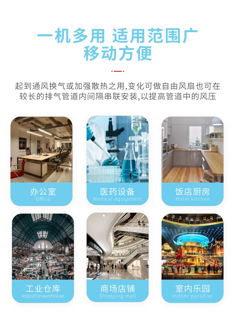 1、适用于高温或有异味的车间:如热处理厂、铸件厂、塑料厂、铝型材厂、制鞋厂、皮件厂、电镀厂、各种化工厂。2、适用于劳动密集型企业:如服装厂,各类装配车间,网吧。3、园艺温室大棚通风降温、畜牧场降温。4、特别适用于需要降温又需要一定湿度的场所。如棉纺厂、毛纺厂、麻纺厂、织布厂、化纤厂、经编厂、加弹厂、针织厂、丝织厂、袜厂等各类纺织厂。5、适用于仓储物流领域。