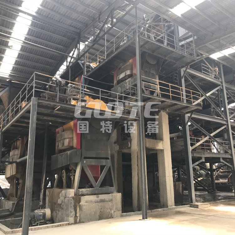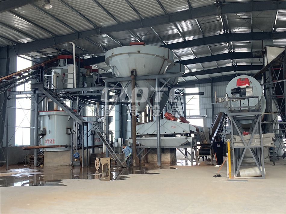 一般工艺流程为:“原矿—粗碎—中碎—预先筛分—磨矿—脱泥—粗粒分级—脱泥—板式磁选机粗选—立环高梯度磁选机细选—细粒分级—脱水”的工艺流程进行湿法长石的生产。生产过程:铲车将原矿送入料仓,料仓尾部放置一台输送机,从尾部出来的原矿通过输送机经振动给料机均匀给入正下方的颚式破碎机(粗破),进行初步破碎。然后,产成的粗料由输送机输送至细碎机进一步破碎,细碎后的石料进振动筛,筛分出两种大小不同的石子、石块,超过规格的大石块返回细碎机,再一次破碎。筛下物料进入棒磨机,从棒磨机出来的物料经圆筒筛分级,筛上返回棒磨机。筛下物料进入受阻沉降机和水力分级机进行分级。分级后的成品经高场强板式磁选机和立环高梯度强磁选机进行除铁后。除铁后的精砂经脱泥斗脱水后打入砂库。