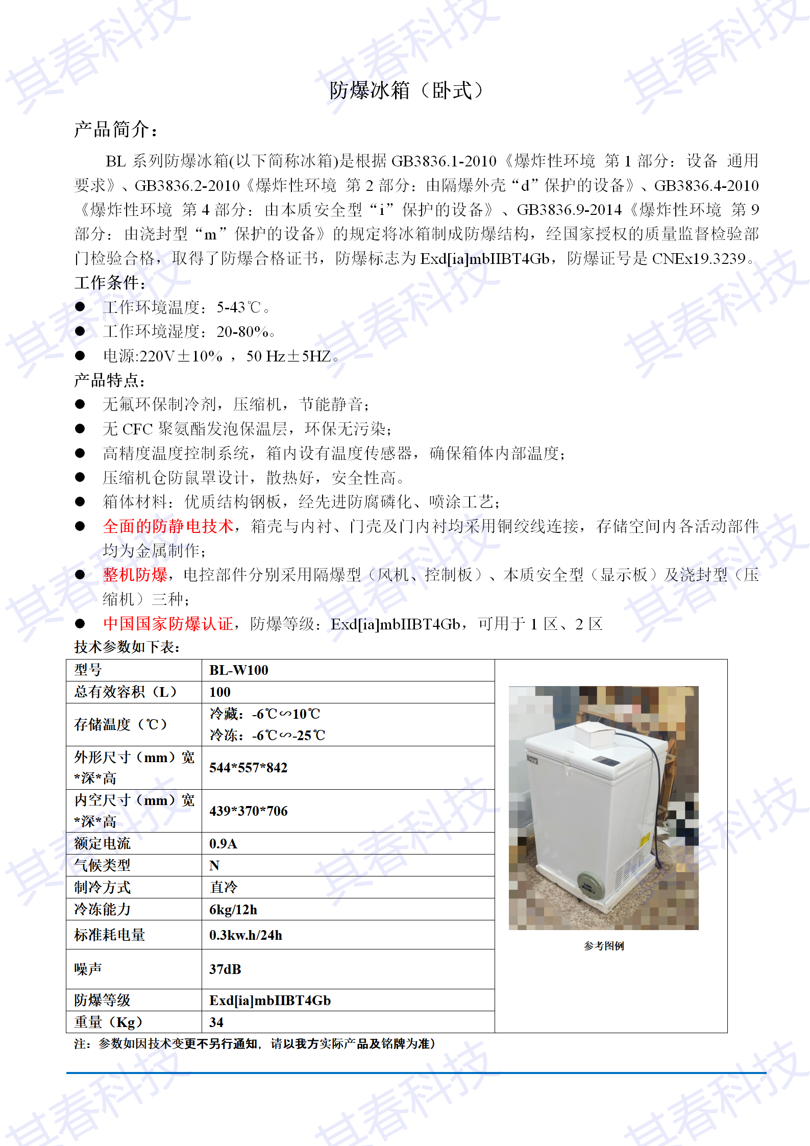冰箱由箱体钣金组件、制冷系统、控制系统和附件构成。箱体钣金件材质为不锈钢或优质钢板。在制冷系统中,主要组成有压缩机、冷凝器、冷凝风扇、蒸发器、毛细管节流器、干燥过滤器及附件,自成一个封闭的循环系统。控制系统中主要有防爆电气控制箱、感温探头等组成。产品设有接地连接件,配套各防爆电气部件可靠连接在接地螺栓上。