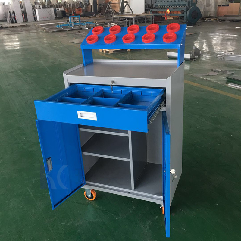 产品描述:刀具柜柜面上部配一斜面刀具架,可以存放常用刀柄,取放方便;下配一抽屉,抽屉内配两纵三横调节插板 方便 工件和量具进行分类,查找方便,提高工作效率,抽屉采用三节走珠导轨,承重40kg以内;下面配两扇对开门,门 内配两横一纵隔板,合理利用空间,存放多点工具;底部配一副4寸两定两活带刹车聚氨酯脚轮;方便移动柜子周转。。
