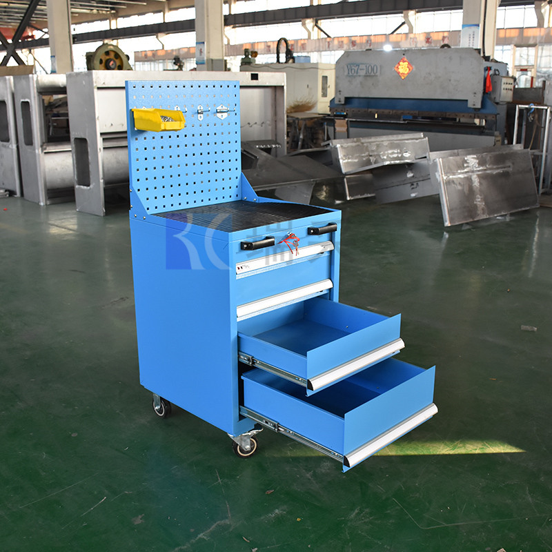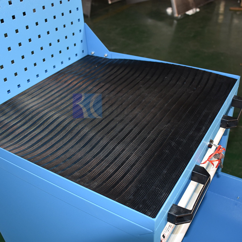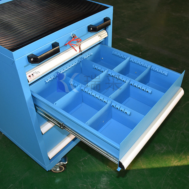 配置:标配3mm黑色防滑胶垫4寸脚轮,两定两万向带刹车,台面下配4抽屉采用三节走珠滑轨,单抽承重50kg,采用一锁控制 4抽屉装置,每抽配独立自锁装置。