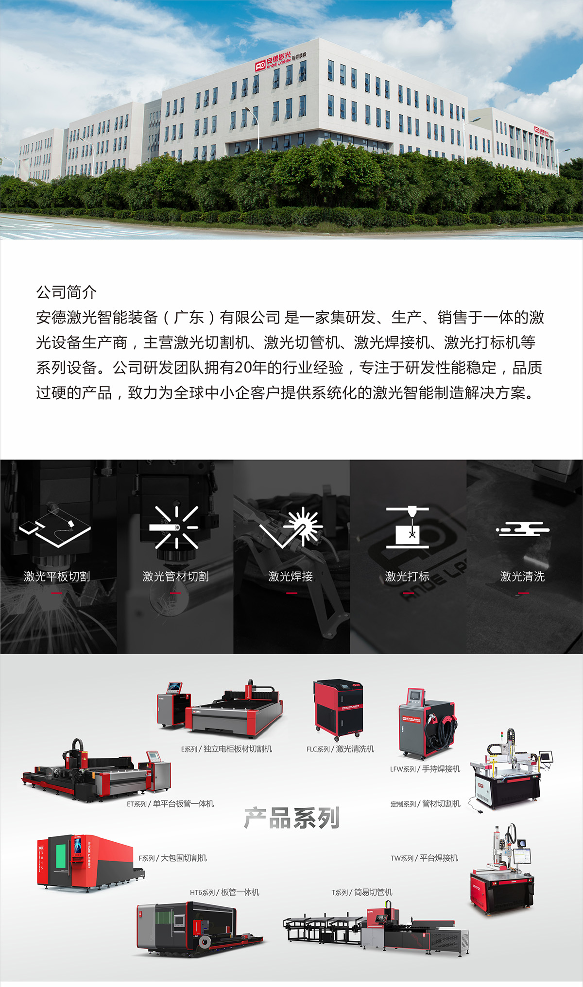 安德激光智能装备(广东)有限公司 位于广东省江门市,是一家集研发、生产、销售于一体的激光设备生产商,主营激光切割机,激光切管机,激光焊接机、激光打标机等系列激光设备。公司拥有面积达53000㎡自建智能化产业园区,研发团队拥有20年的行业经验,一直致力为中小企客户提供系统化的激光智能制造解决方案。