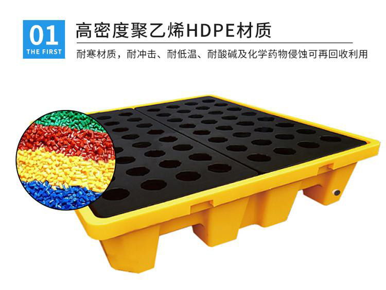 防渗漏塑料托盘结构的可靠性大大降低了托盘的损害消耗和由于托盘损害造成托盘上物料的损害,采用加厚侧边框及中心承重结构,坚固耐用。防渗漏塑料托盘双叉车插口便于搬运,当出现泄漏时,所有液体会沿托盘盛漏区域内,不会污染现场环境。华康生产的防渗漏塑料托盘有不同型号的规格可以选择,满足各种尺寸需求,便于您合理规划化学品或对化学品仓库经理整改。防渗漏托盘整体采用一体成型,无缝结构设计,防漏结构通过测试,避免泄漏发生。采用线性低密度聚乙烯材质生产,具有良好的耐酸耐碱耐腐特性,避免造成环境危害。