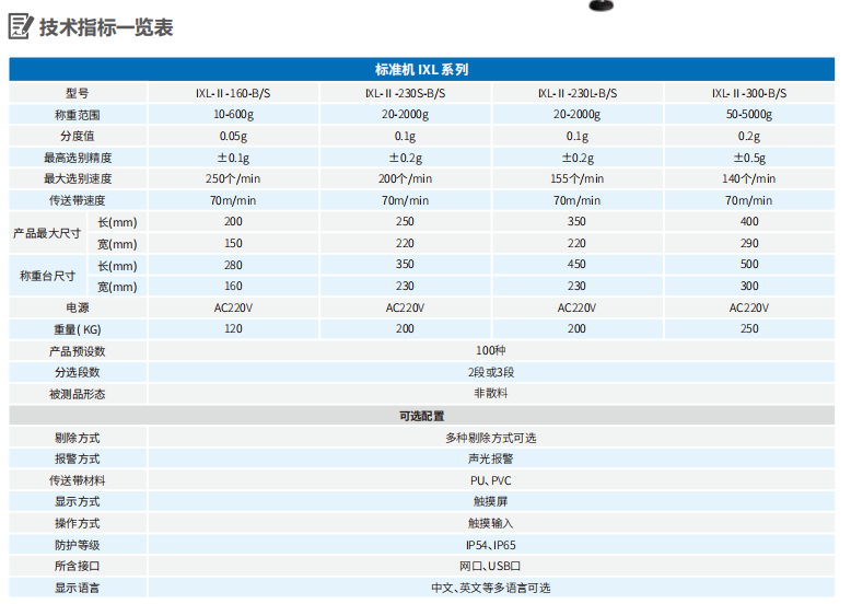 标准型重量选别机可实现高速、高精度、高稳定性的动态检测,采用进口高精度传感器。