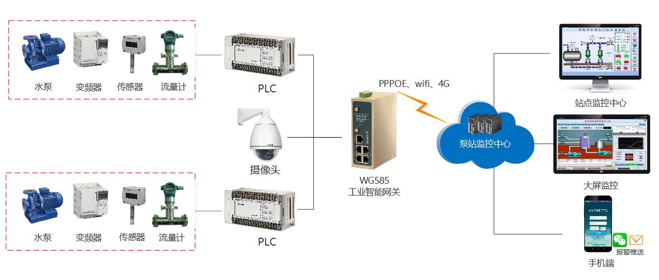 物通博联WG585智能网关通过网口或串口与PLC连接,采集泵的运行状态,水位,压力,流量等信号以及摄像头,通过4G/有线/WiFi方式上网,将数据传到泵站监控中心(可以是物通博联云平台也可以是第三方云平台),泵站管理人员可以在泵站监控中心远程监测站内水位或压力、泵组工作状态、出站流量、出站压力等;支持泵启动设备手动控制、自动控制、远程控制泵组的启停,同时通过电脑端或手机端云组态监控,远程修改泵站PLC的程序,实现泵站无人值守。产生故障会以短信或微信推送给相应的运维人员。