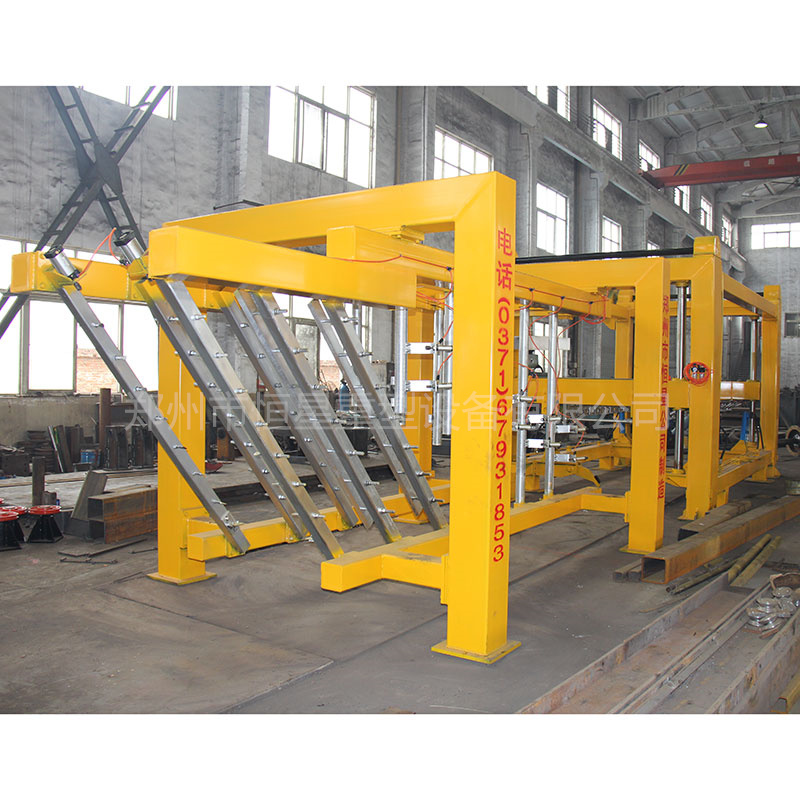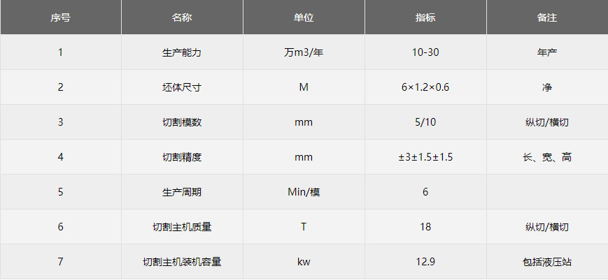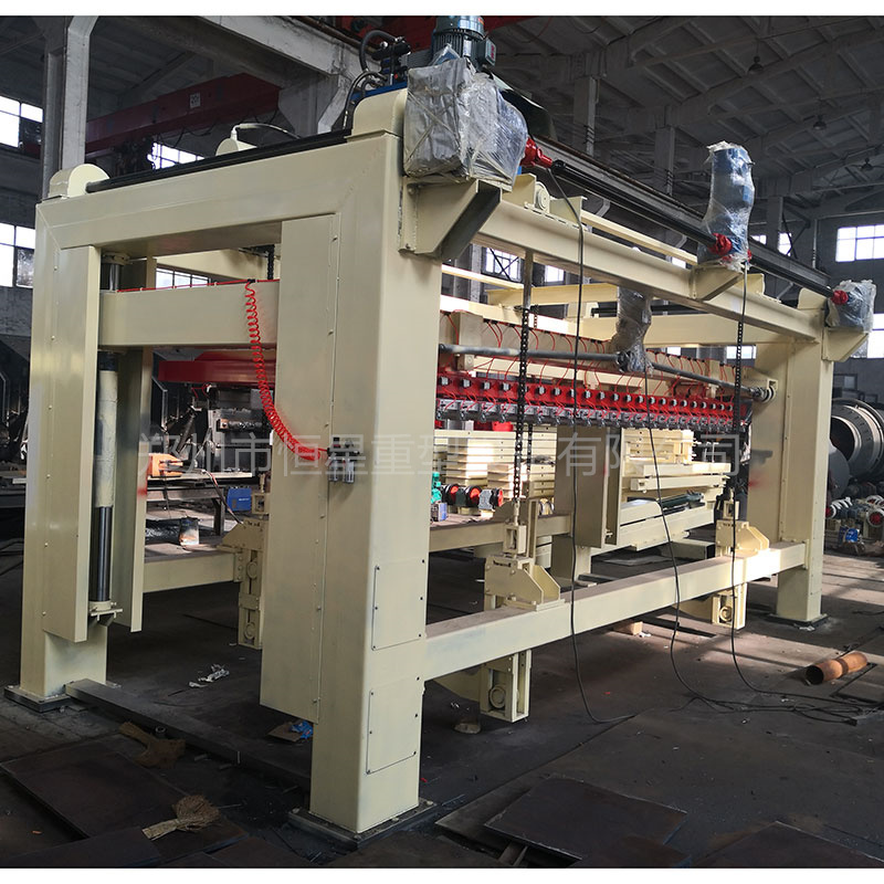 翻转吊具把模具空中翻90度后脱模把坯体连同模具侧板放置在切割小车上,切割小车通过电机启动自身行走缓缓地通过纵切装置纵切完后,切割小车再行走至横切装置中间位置停止后,横切装置启动,横切架自上而下垂直降落,对还体进行横向切割,切割直至上升复位。