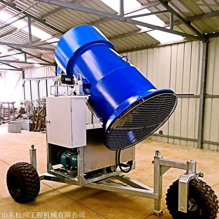 造雪机是一种可以迅速把大量液态水转化成为高压雾化冰晶的电气装置,主要用于人工造雪,布置人工滑雪场地、消防等方面。多数配有方便移动的履带式车轮,上载有直径较宽(直径约半米)粗短的喷雪炮筒。数配有方便移动的履带式车轮,上载有直径较宽(直径约半米)粗短的喷雪炮筒。一般采用传统的高压水与空气混合造雪。其工作流程是,来自高压水泵的高压水与来自空气压缩机的高压空气在双进口喷嘴处混合。利用自然蒸发和空气出喷嘴后的体积膨胀带走热量而使雾滴凝结成冰晶。