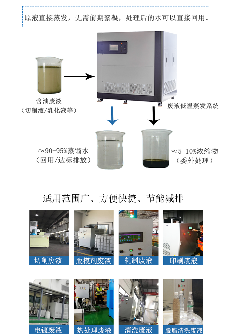 帝昂天科低温蒸馏废液处理设备是一款采用浓缩原理,利用热泵的真空蒸发器,全自动运行的废液处理设备。设备可处理各种废切削液、废脱模剂、水性清洗剂废水等废液,净水比例90%~95%。