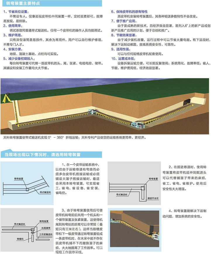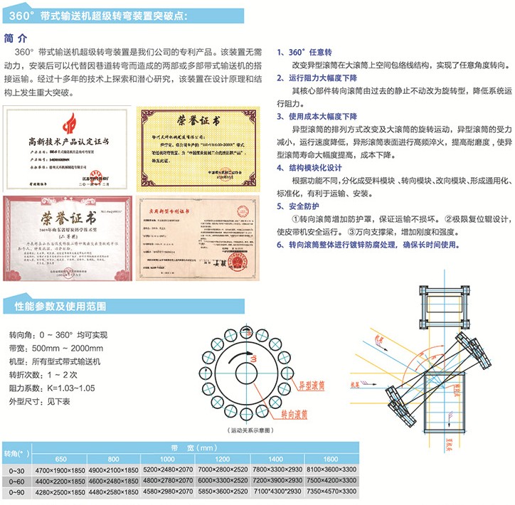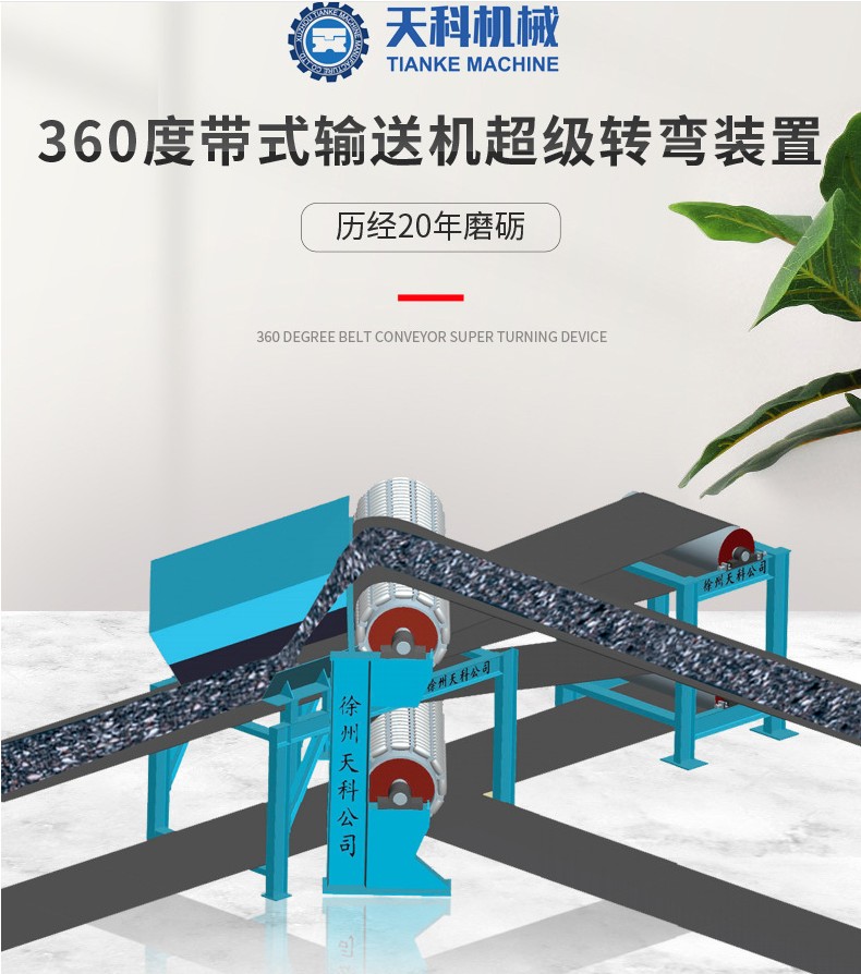 360?带式输送机转弯装置是我们公司的产品。该装置无需动力,安装后可以代替因巷道转弯而造成的两部或多部带式输送机的搭接运输。经过二十多年的技术上探索和潜心研究,该装置在设计原理和结构上取得重大突破。