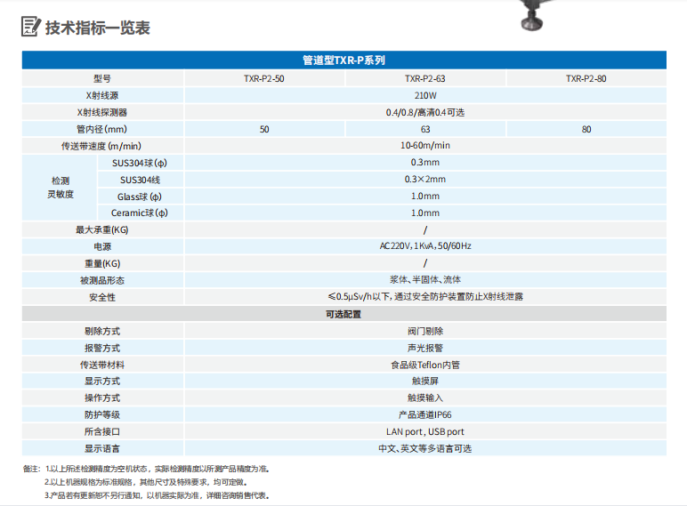 ●继承了TXR常规系列现有的优点。在生产的过程中进行检测,自动报警剔除,避免异物进入下道程序。
