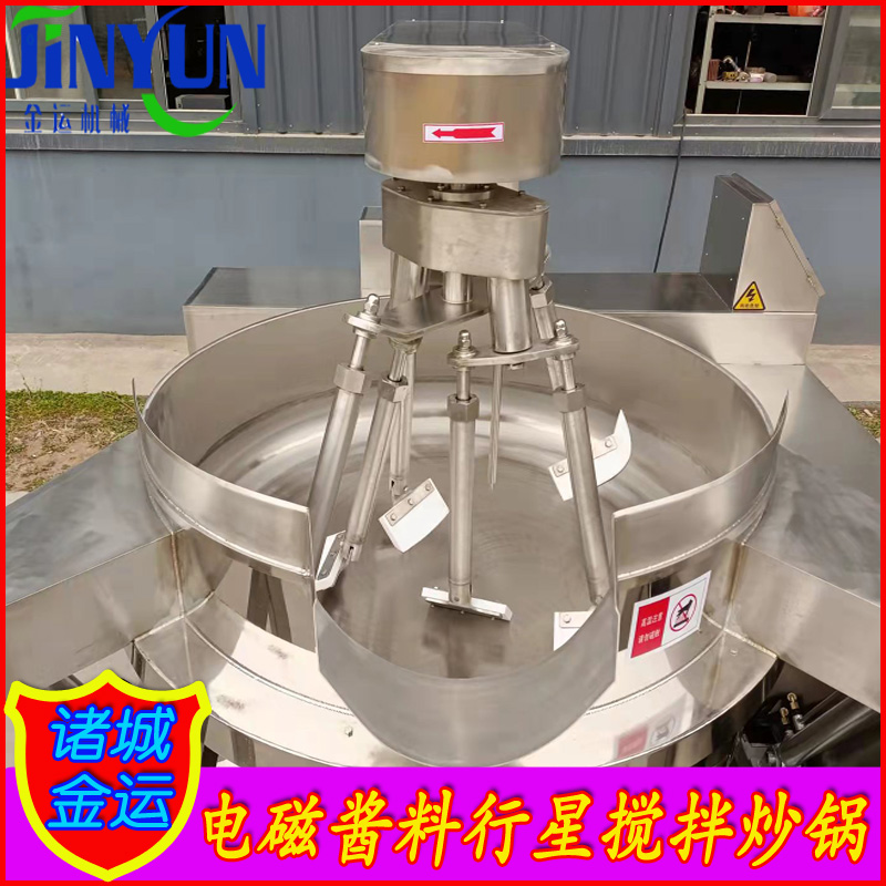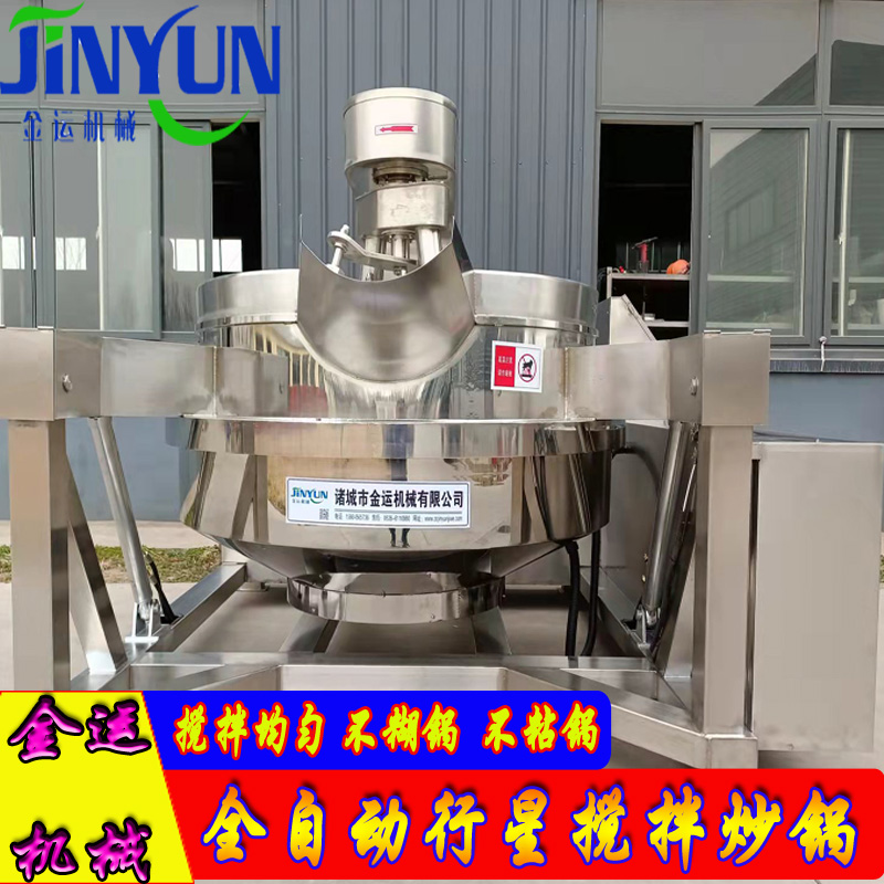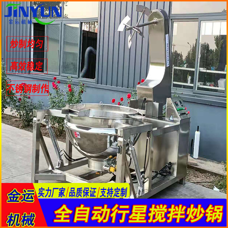 行星搅拌炒锅体为一次冲压成型的半球形不锈钢锅体,采用蒸汽、电加热导热油、液化气、天然气等加热形式,搅拌方式采用特殊的倾斜式传动,使用的行星式搅拌器与锅体充分接触,实现传动公转与自转的不整数传动比,使锅内无搅拌死角,且齿轮的寿命延长。使用先进的传动与密封结构,使传动部分与锅内洁净、卫生。采用变频调速控制动力,使运行更平稳。全自动的设备采用液压升降,自动抬臂,自动翻锅倒料,搅拌器免拆装,节省人力物力,降低劳动强度,是性能优良的食品加工设备。