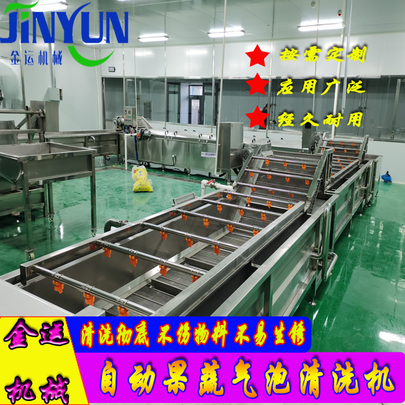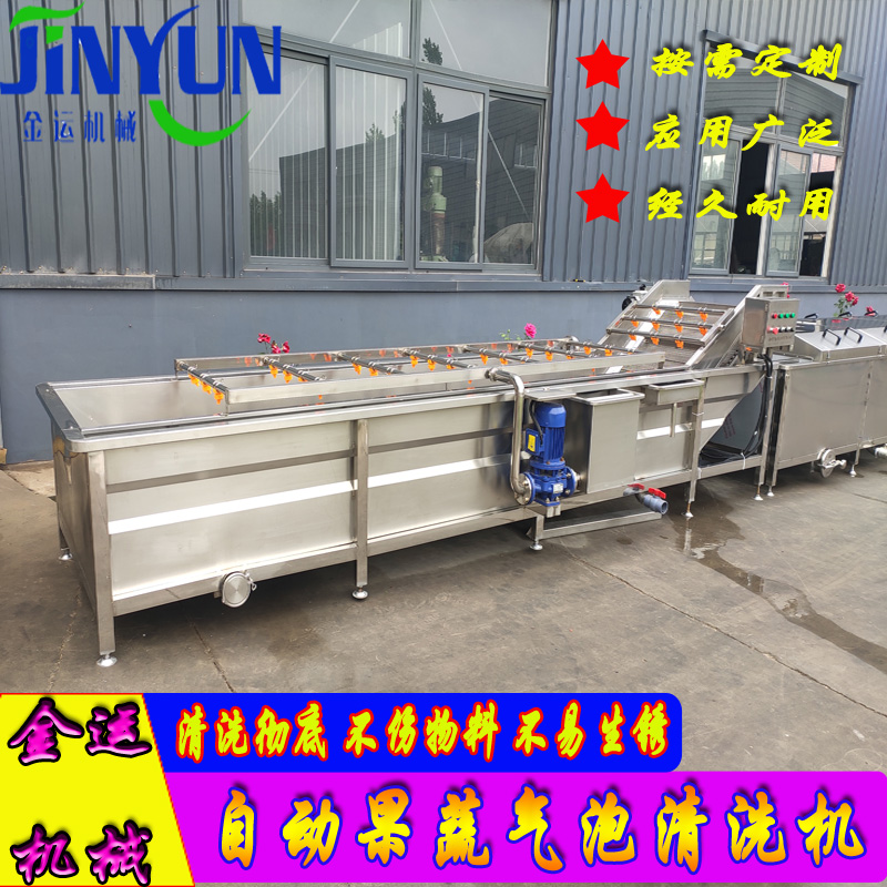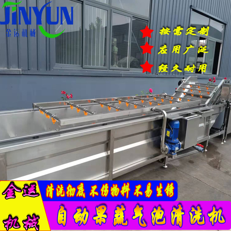 果蔬气泡清洗机是针对果蔬深加工而研发的一款果蔬清洗设备,设备利用气泡发生装置产生气泡使水翻涌在冲击物料表面泥污的同时减少物料之间的摩擦,在清洗的同时使其达到保护物料表皮的作用,喷淋装置配合二次清洗,冲洗物料泥污残渣物料清洗过程中不锈钢输送链传送物料,设备实现自动化连续性作业。