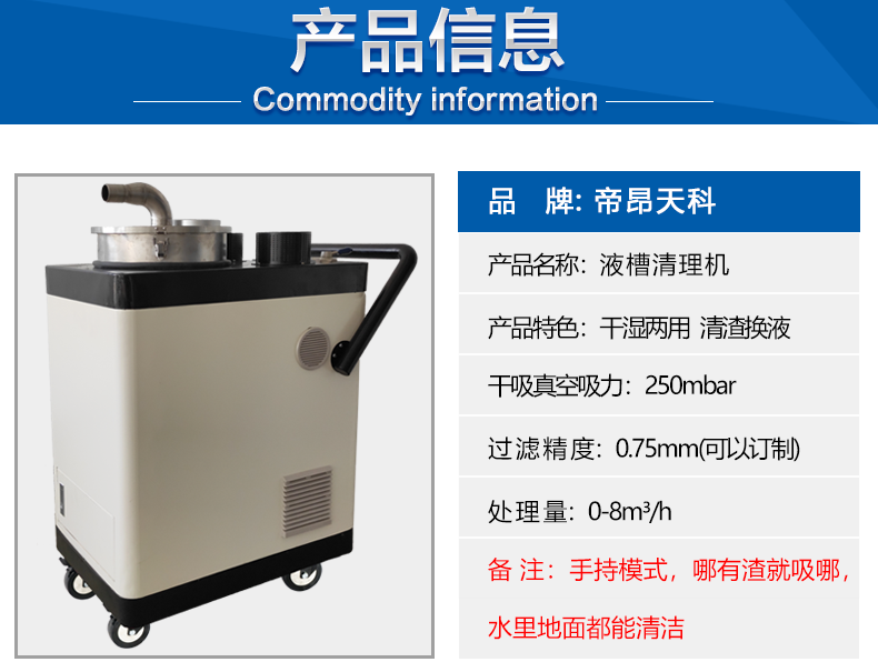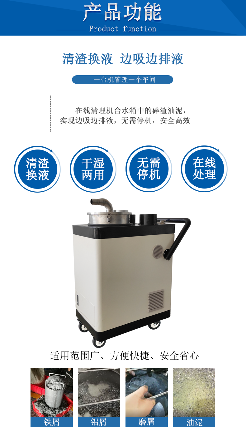 帝昂天科切削液过滤器,超大处理量,边吸边排,快速处理掉切削液里面的铁屑、铝屑等金属杂质,使加工零部件更干净,延长切削液使用寿命,降低刀具耗损。可24小时在想处理,机床不用停机,提高机床作业时间,除渣换液,一步到位,达到切削液去除金属碎屑的效果。