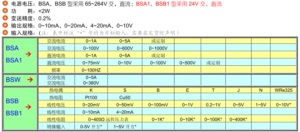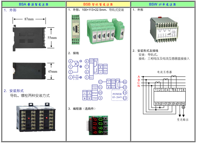 BS系列变送器分为底座安装式普通型(A型)和导轨式安装智能型(B型),以及功率变送(W型)三个类型,其中B型变送器采用单片微处理器设计,内置二十多种线性、非线性输入规格,可用于温度、湿度、压力、液位、瞬时流量等物理量的精确变动。可以通过专用的编程器进行内部编程。具备通信、开方运算等多种辅助功能。W型功率变送器可直接匹配5A电流互感器,220V或380V电压直接接入,接线简洁方便。