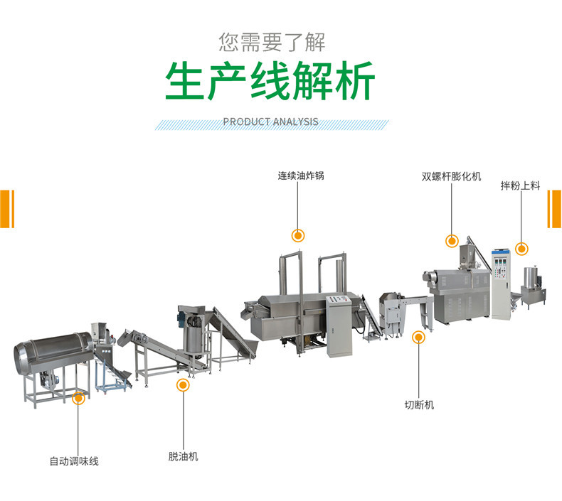 该设备从原料配制、挤压膨化、成型、切断、筛选、喷涂、调料到出成品一次完成,自动化程度很高。该生产线具有机型多、配置灵活、原料范围广、产品种类多、操作简单等特点,选择合适的配置可生产夹心米果、夹芯米饼、膨化米果、麦烧、大虾、营养早餐、麦香鸡块等产品。经膨化后的食品具有口感酥脆、易消化、香味独特、携带方便,是消费者理想的休闲食品。