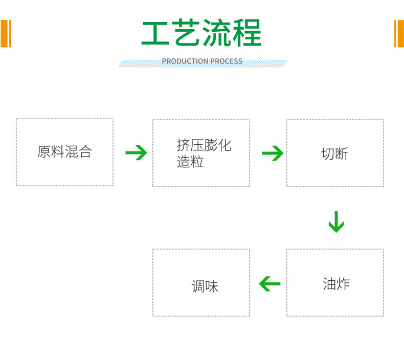原料混合→挤压膨化→整形切断(→注芯)→筛选→烘烤→喷涂调味→烘烤→冷却→包装
